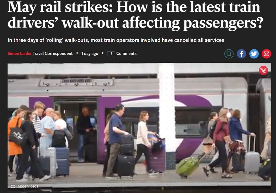 5月9日:罷工會影響LNER,Northern Trains,TransPennine Express,涉及到倫敦周邊和英格蘭西部、巴斯、布里斯托、卡迪夫。